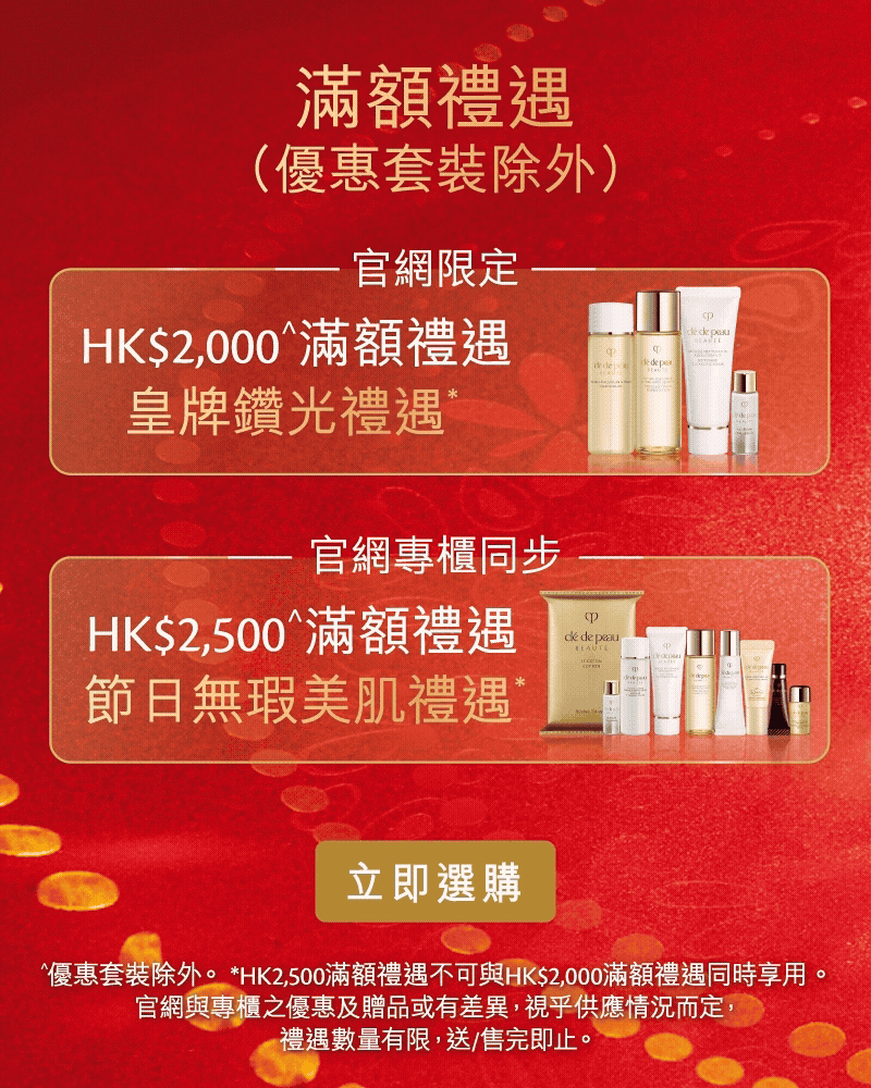 條款及細則: *HK$2,000及HK$2,500滿額禮遇不可同時享用。 禮遇數量有限,送/售完即止。新會員指未曾於線上及線下購物。官網與專櫃之優惠及贈品或有差異,視乎供應情況而定,數量有限,售/送完即止。圖片僅供參考。 如有更改,恕不另行通知, 以實物為準。 如有任何爭議, Clé de Peau Beauté保留最終決定權。